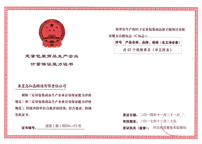 定量包裝商品生產企業計量保證能力證書